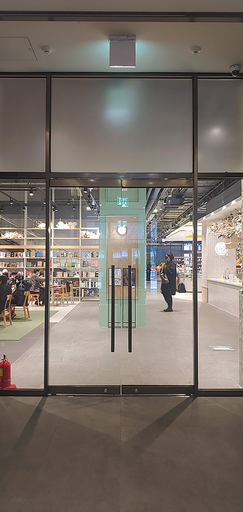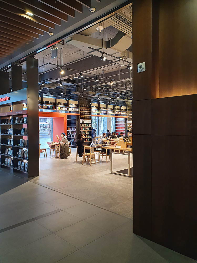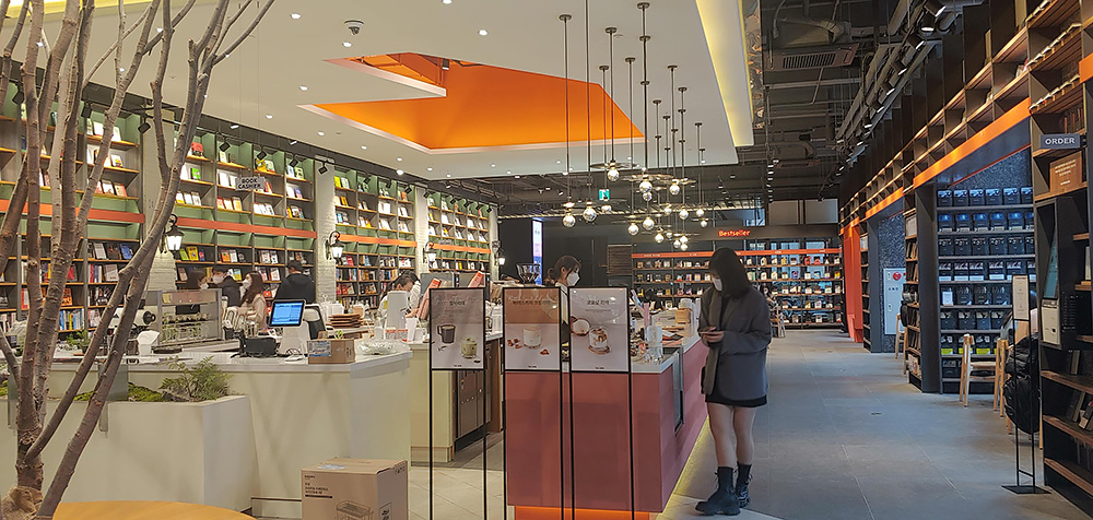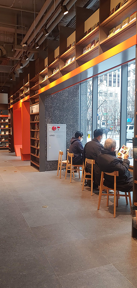 문을 열고 안으로 들어가면 공간 가운데서 점원들이 주문을 받고 있습니다. 사방에 책꽂이가 있는 게 눈에 띕니다.