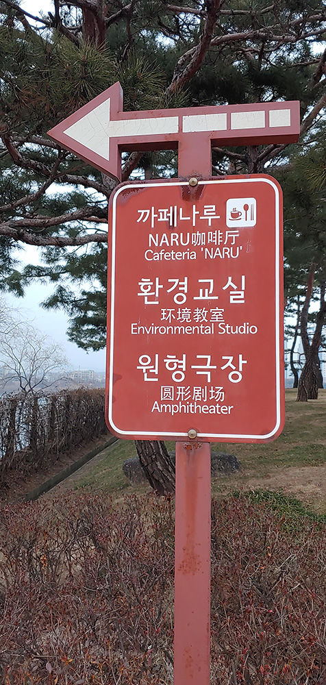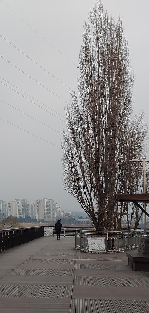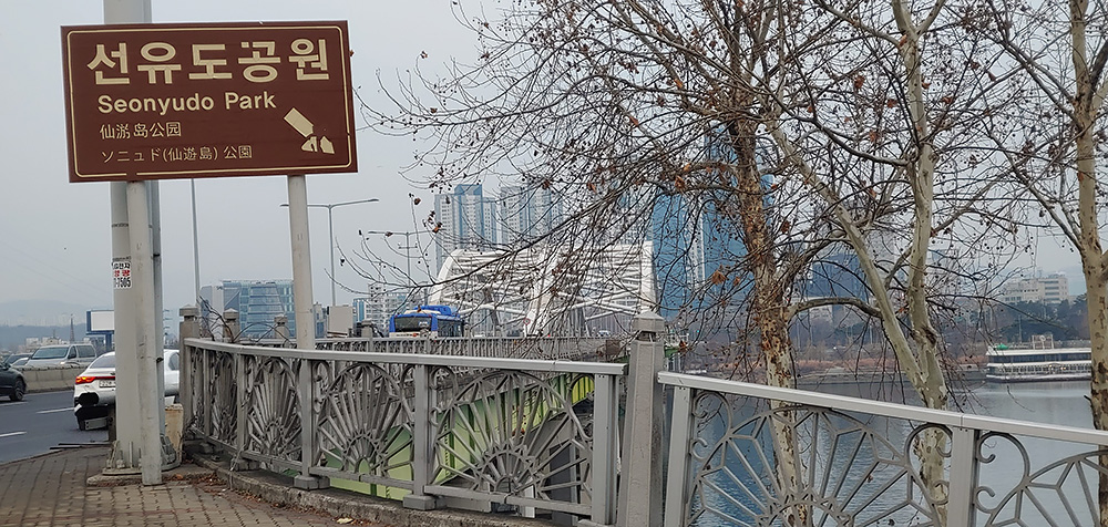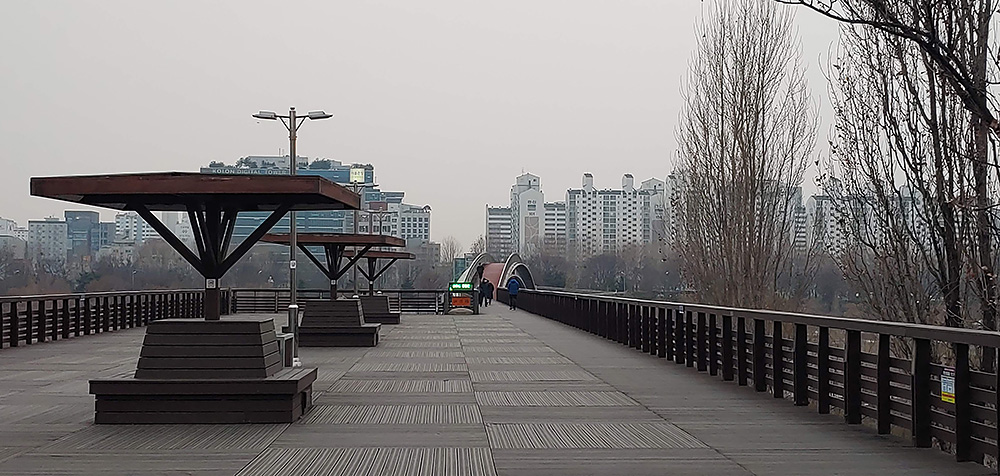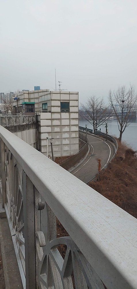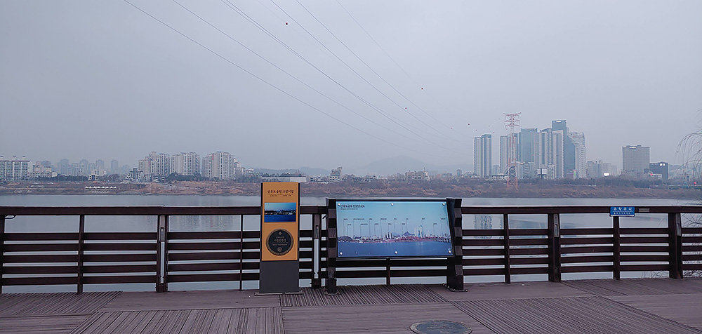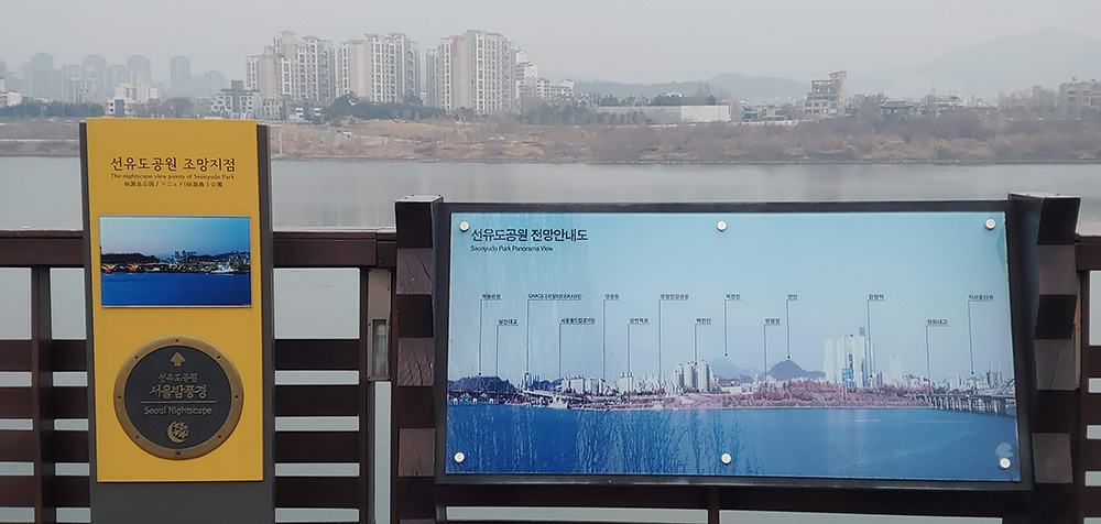 선유도공원 조망지점으로 다가갑니다. 건너편 중앙에 북한산, 안산이 있고 오른쪽으로 합정역과 양화대교, 왼쪽으로 서울월드컵경기장, DMC(디지털미디어시티)가 있습니다. 날씨가 흐려서 잘 보이지 않습니다. 안타깝네요.