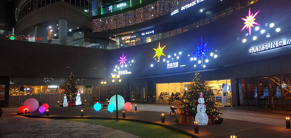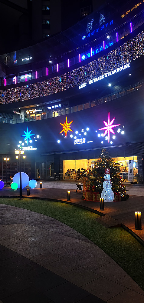 딜라이트스퀘어 1층 풍경입니다. 아직 1월이라 크리스마스 연말의 여운이 남아있습니다. 교보문고, 커피기업, 감성타코 간판에 별장식이 반짝이네요.