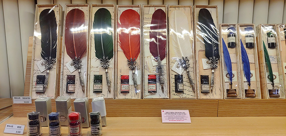 깃털펜도 예쁘네요. 깃털펜은 유럽에서 1000년 넘게 사용된 필기구라고 합니다. 오리지널 깃털펜은 거위 깃털로 만들었고 백조 깃털로 만든 것은 더 비쌌다고 하네요.