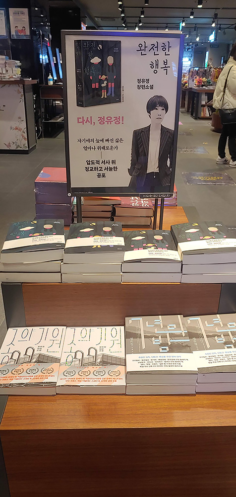 딜라이트스퀘어 교보문고 합정점에 도착하였습니다. 잠시 책들을 구경합니다. 정유정 작가의 책들이 진열되어 있네요. <7년의 밤>, <종의 기원>, <내 심장을 쏴라>를 재미있게 읽었어요. <완전한 행복>도 읽어봐야 겠네요.