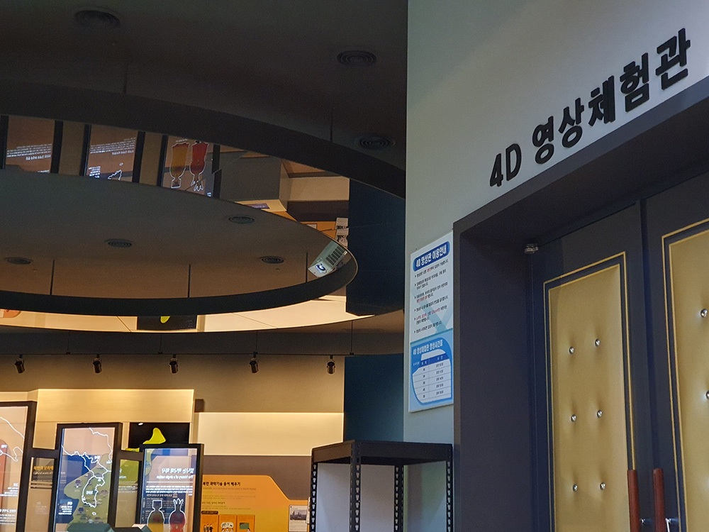 통일관에서는 정해진 시간 별로 4D 영상을 체험할 수 있습니다. 상영관 앞에서 나눠 주는 안경을 쓰고 좌석에 앉으면 4D 영상이 시작 됩니다. 영상은 7분 가량이고 내용은 남한에서 북한으로 연결되는 미래 열차를 시범 운행하는 데 문제가 생기고 그것을 잘 해결합니다.